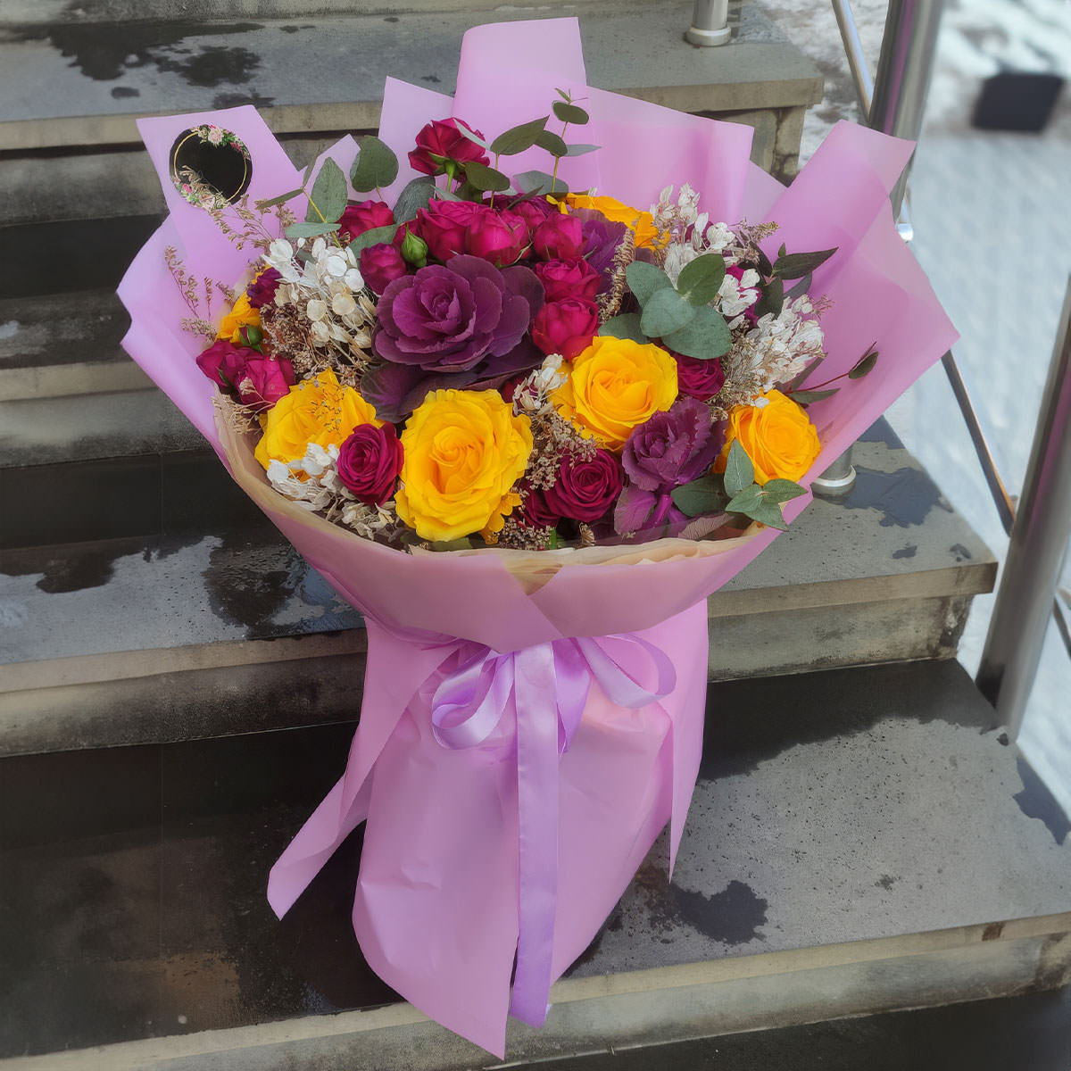 Брассика, роза кустовая розовая, роза одноголовая желтая, эвкалипт, лунария. Упаковка (лента, пленка, крафт, сетка, пленка матовая)