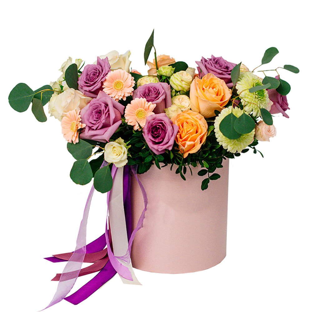 Роза одноголовая микс (сиреневая, персиковая), гербера мини кремовая, роза кустовая кремовая, зелень. Упаковка (шляпная коробка, квадратный бокс, коробка сердце, оазис)