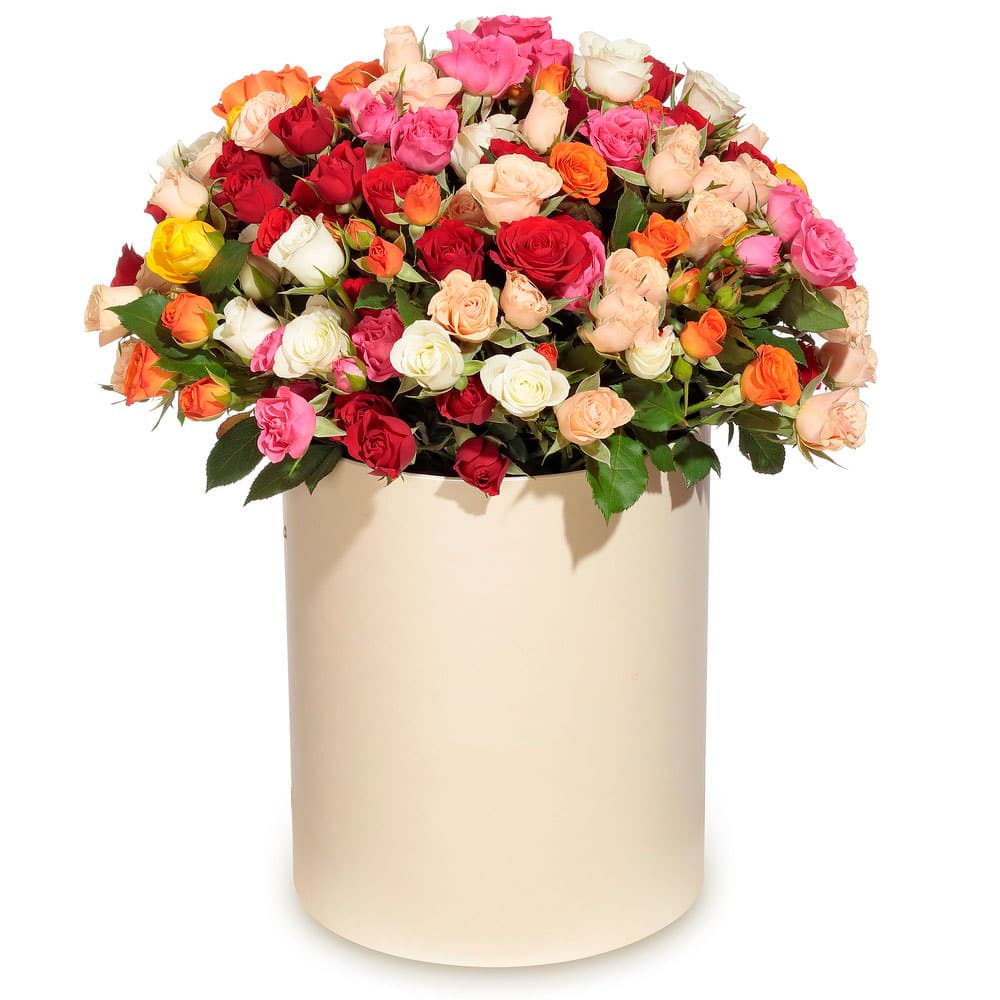 Роза кустовая микс (кремовая, оранжевая, красная, розовая). Упаковка (шляпная коробка, квадратный бокс, коробка сердце, оазис)